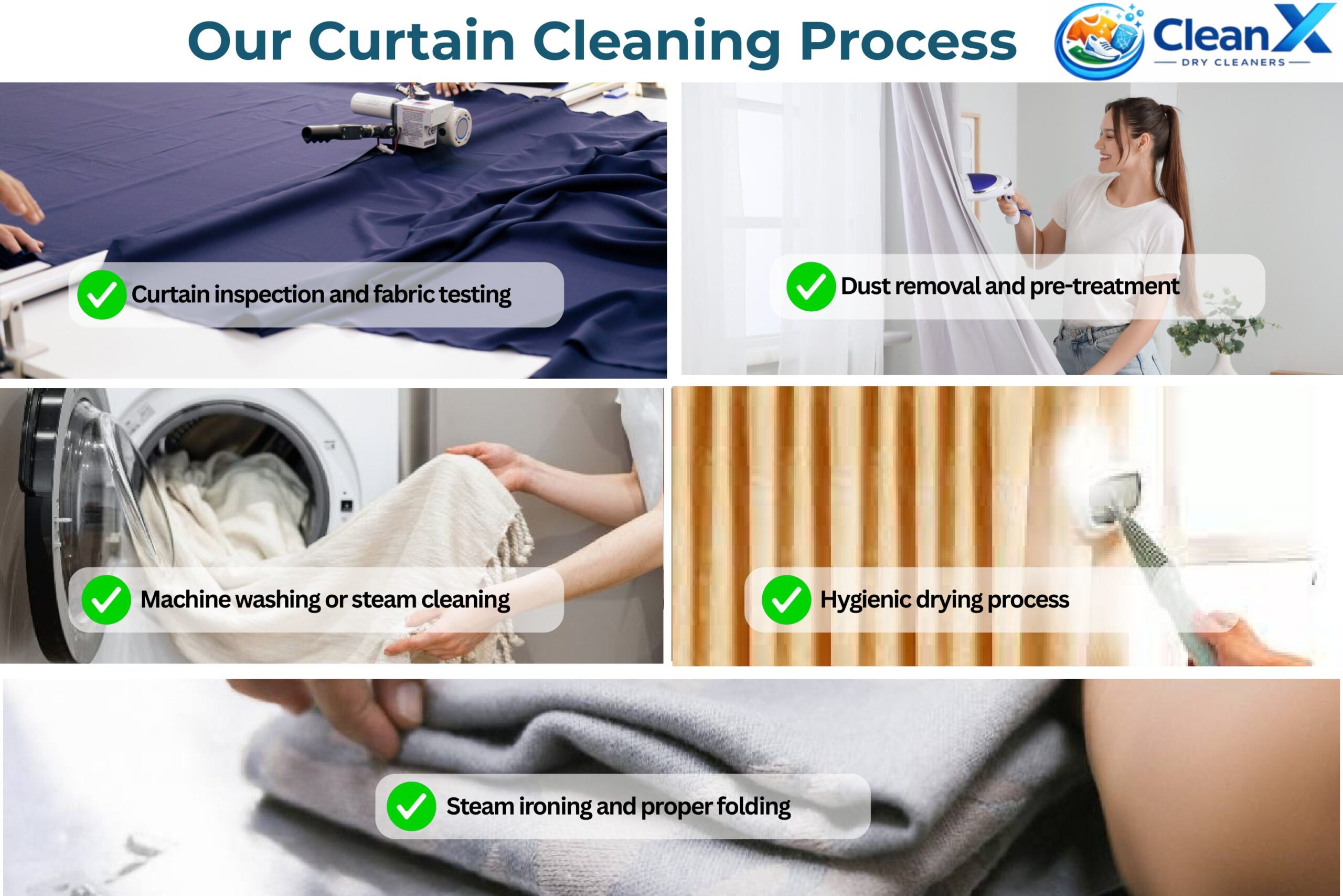 "Curtains look fresh and clean after service."